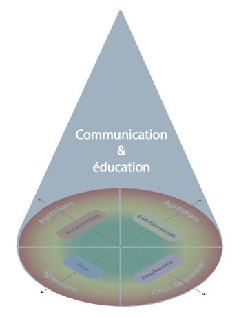 On peut répartir les comportements selon 4 axes principaux. L’axe de la peur, l’axe des autocontrôles, l’axe de l’attachement et l’axe de l’insertion sociale. Ayant ces axes en tête on peut rapidement déterminer quels sont ceux qui dysfonctionnent chez le chien ou pour lequel les propriétaires sollicitent l’aide de l’équipe soignante.