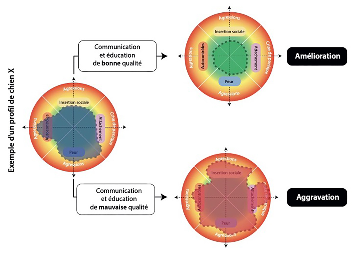 En balayant ces 4 axes, peur, autocontrôles, attachement, insertion sociale on peut rapidement évaluer s’il existe un ou plusieurs axes pour lesquels l’animal sort de la zone verte.