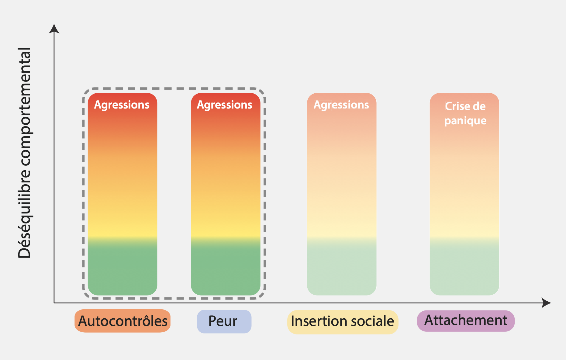 Plus les comportements du chiot s’éloignent de la zone verte sur un ou plusieurs axes, plus sa santé mentale est compromise. Les zones rouges sont les zones extrêmes dans lesquelles les agressions apparaissent. C’est un signe d’alerte grave, une prise en charge rapide devra alors être proposée.